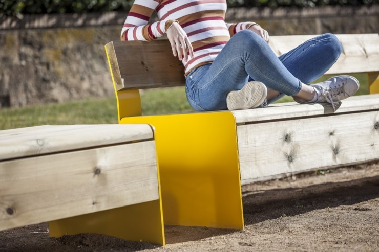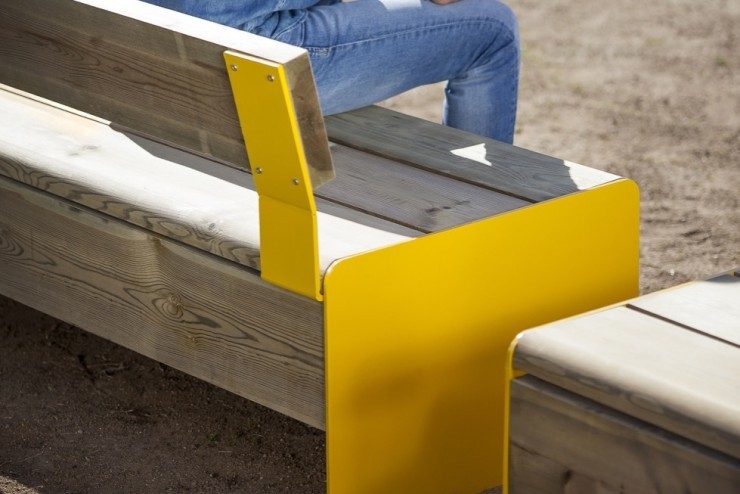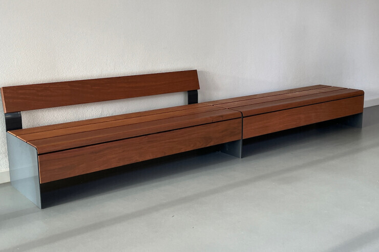 De Bru banken en zitelementen zijn onderdeel van een veelzijdige serie straatmeubilair met een zitting en rugleuning gemaakt van houten latten die ondersteund wordt door een frame van staal. Dankzij de brede keuze aan kleuren van de staaldelen en de verschillende maten en uitvoeringen is het Bru buitenmeubilair bijzonder geschikt voor originele toepassingen in (semi) openbare binnen- en buitenprojecten.