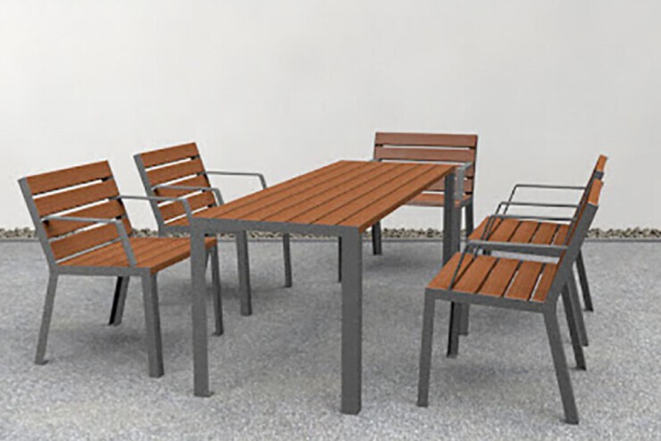 De meubelserie Hop Hop biedt een ruime keuze aan banken, stoelen, tafels en loungebanken voor de openbare binnen- en buitenruimte. Het ontwerp kenmerkt zich door eenvoud en rechte lijnen. Het houten tafelblad uit het Hop Hop assortiment straatmeubilair is gemaakt van larikshout of thermisch behandeld essenhout. De latten zijn licht gegroefd, waardoor kleinere krasjes minder zichtbaar zijn. Het metalen onderstel is gemaakt van thermisch verzinkt staal.