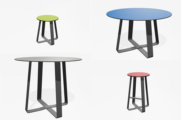 Zitting en tafelblad van HPL (hogedruklaminaat). Frame van thermisch verzinkt en gepoedercoat staal.