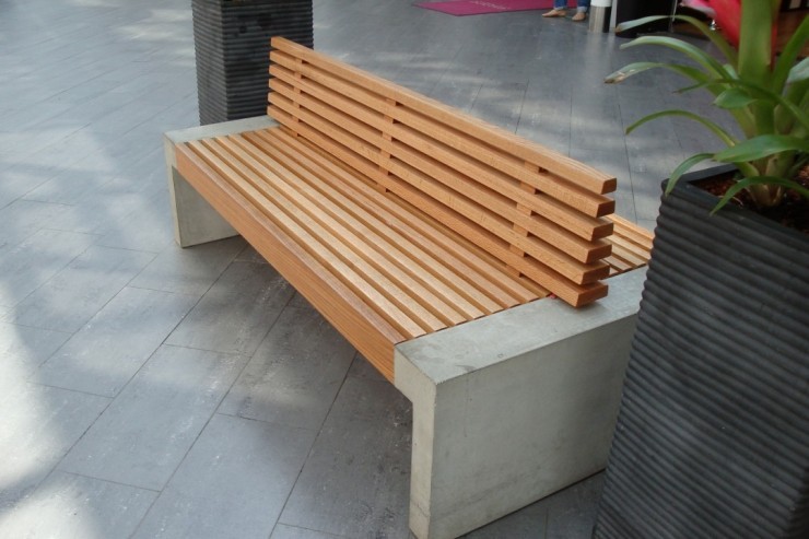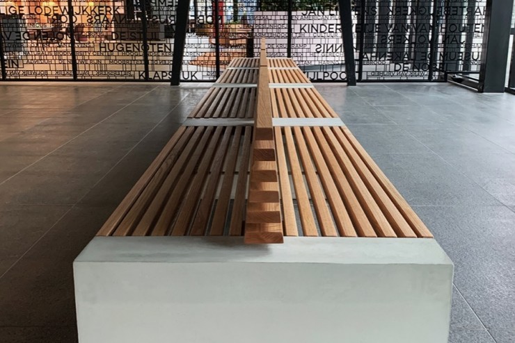 Zijpanelen: beton. Zitting en rugleuning: mahonie, eiken of grenen.