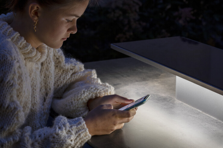 In de avond strijkt het licht van de SunHub over het tafelblad, waardoor er een gezellige sfeer ontstaat. De SunHub werkt 100% op zonne-energie, is bestand tegen alle weersomstandigheden en is CO2 neutraal.