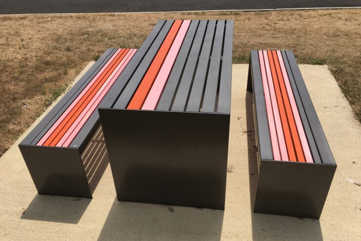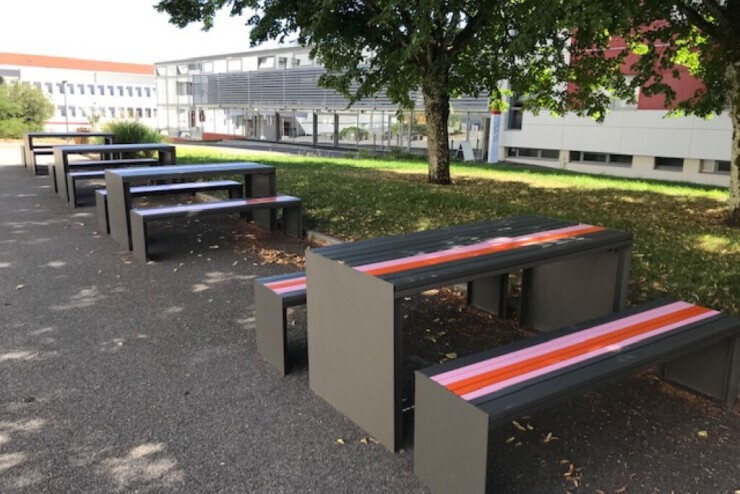 - Banken en tafel die in combinatie een natuurlijke picknickplek vormen