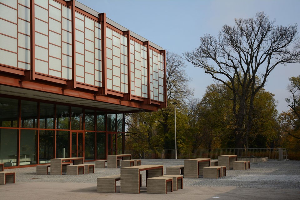 Zitvlak en tafelblad uit larikshouten of essenhouten latten en een frame van staal.