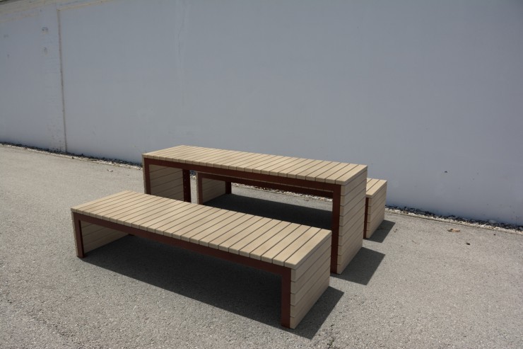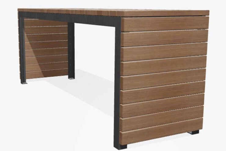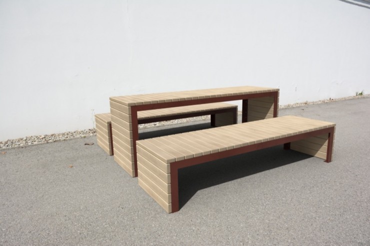 Zitvlak en tafelblad uit larikshouten of essenhouten latten en een frame van staal.
