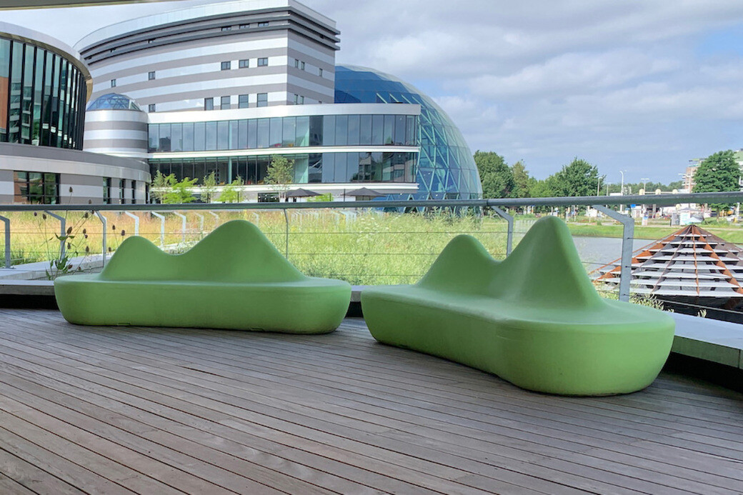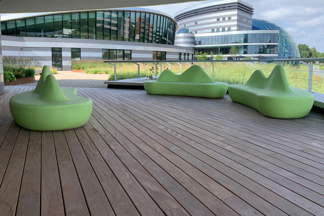 Aan de schaduwkant van het AFAS-gebouw is een koele werkplek gecreëerd onder een overkapping. Medewerkers gebruiken dit als vergaderlocatie en lunchplek. Hier is gekozen voor drie opvallende Shark banken in de kleur limegroen. Perfecte eyecatchers die de ruimte een eigen karakter en sfeer geven.
