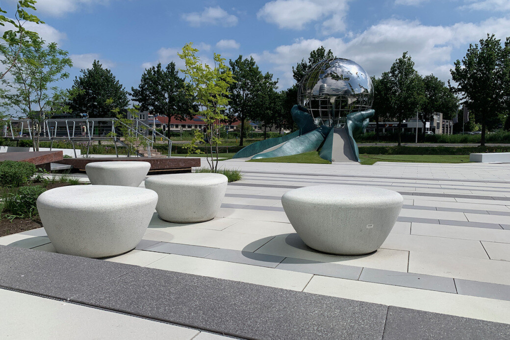 Naast de hoofdingang zijn een aantal opvallende ‘objecten’ geplaatst die de ruimtelijke werking benadrukken. De massieve Supercell zitelementen zijn gemaakt van architectonisch en gezuurd beton. Bezoekers kunnen zich niet bezeren aan scherpe randen of hoeken. Daarbij is dit zeer robuuste meubilair voor de (semi) openbare ruimte vandalismebestendig en bestand tegen ieder weertype.