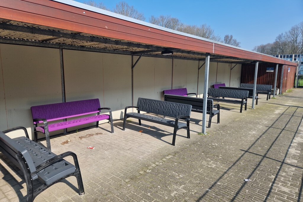 Leuk detail: de paarse tint uit de huisstijlkleuren van de school komt ook terug in de Maverik banken van de Spaanse leverancier Fábregas.