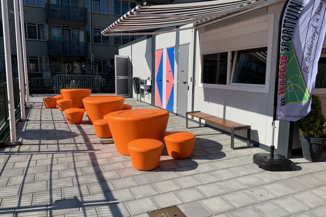 Zit - speel - ontmoet op knaloranje buitenmeubilair