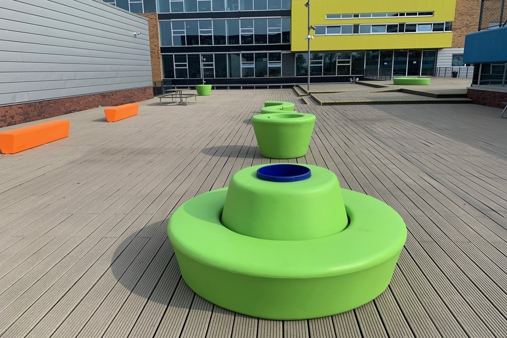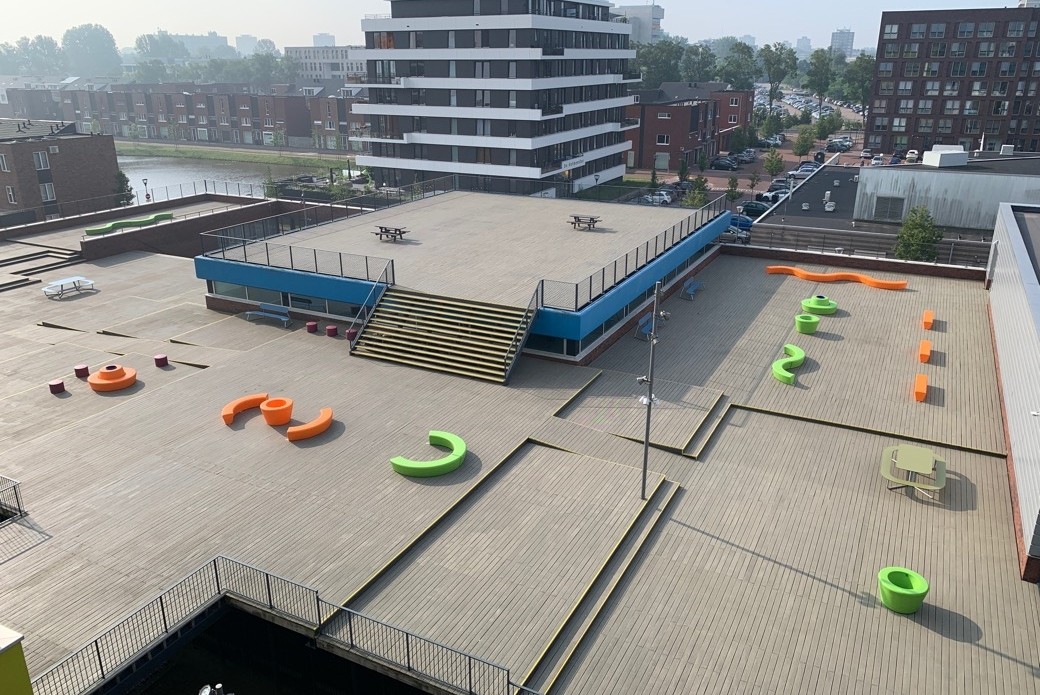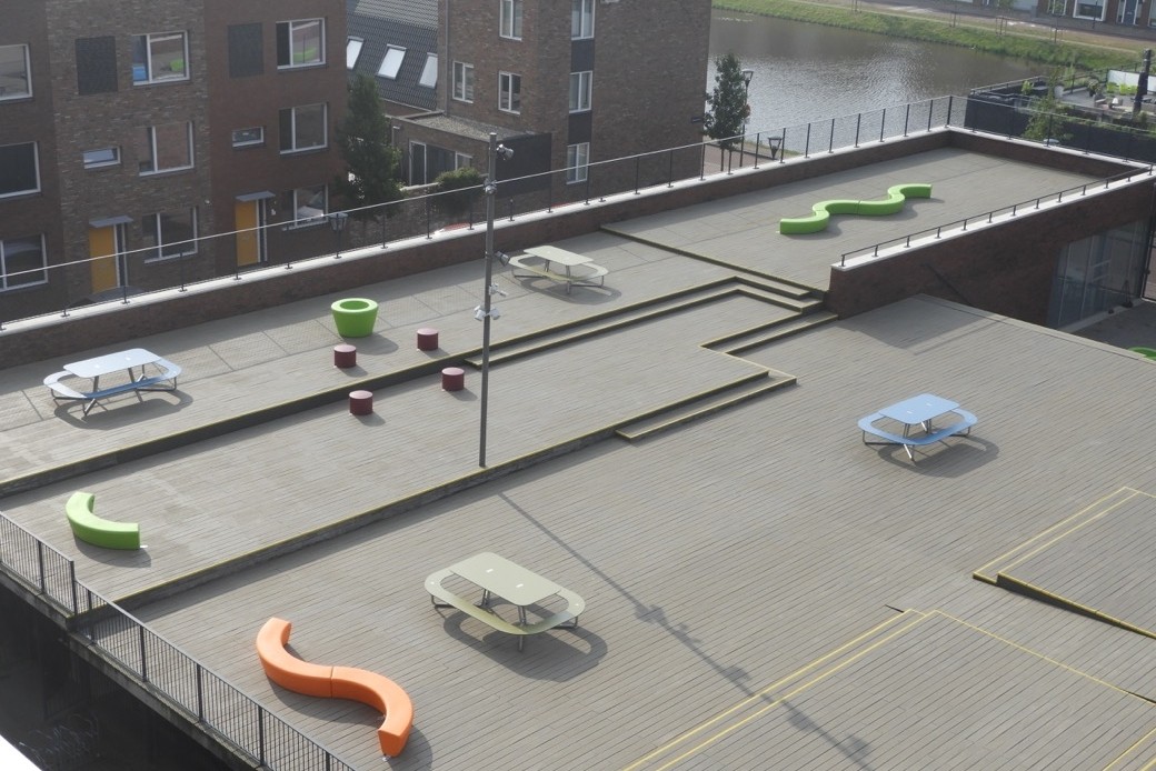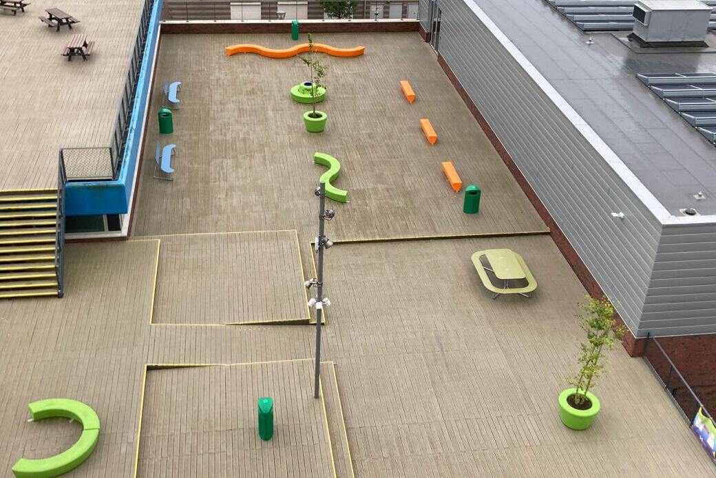 Op het schoolplein is een vrolijk assortiment stoer en onverwoestbaar schoolmeubilair geplaatst dat tegen een stootje kan. Even geen les? Zitten, hangen, chillen kan vanaf nu op verschillende banken uit de Loop serie zoals de Arc, de Ronde Loop Bank die samen met de Loop Cone bank met rugleuning vormt, de Loop Cone plantenbak, de Loop Line en de ronde HopOp 500 zitelementen. Ook kunnen de leerlingen heerlijk buiten lunchen of samen huiswerk maken aan de kleurrijke Plateau picknicktafels. Het meubilair is bestand tegen alle weersomstandigheden en is stevig verankerd op de grond. Kortom de schoolleiding heeft er geen omkijken naar!