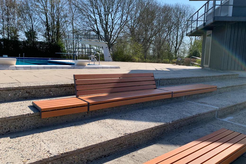 Bouwbedrijf Vaessen uit Raamsdonksveer was op zoek naar houten zitelementen voor op bestaande betonnen traptreden. Deze deden dienst als zitplaatsen en bepaalden in belangrijke mate het beeld van het buitenzwembad. Door de Hop Hop zitelementen te plaatsen ontstaat er een vriendelijker uitstraling en kunnen bezoekers een stuk aangenamer zitten.