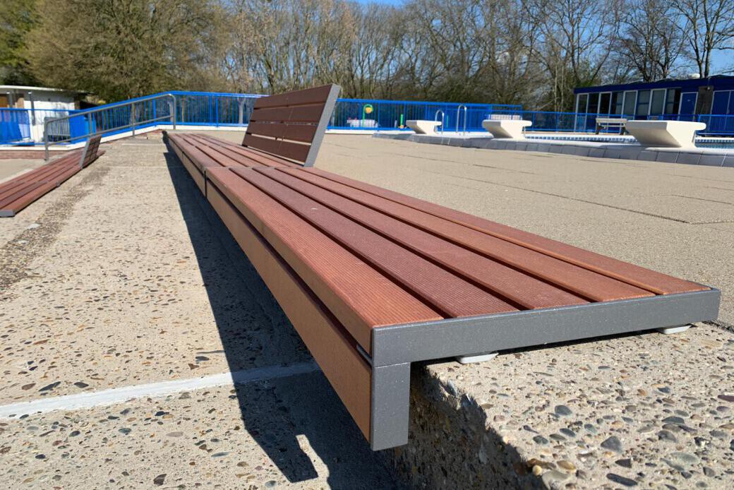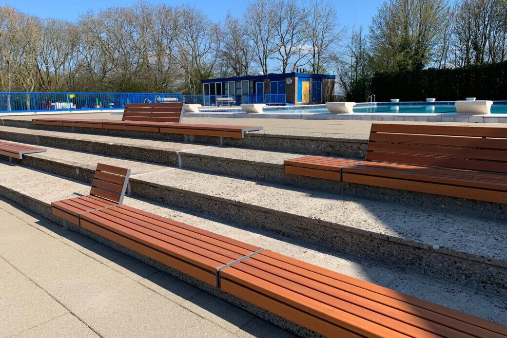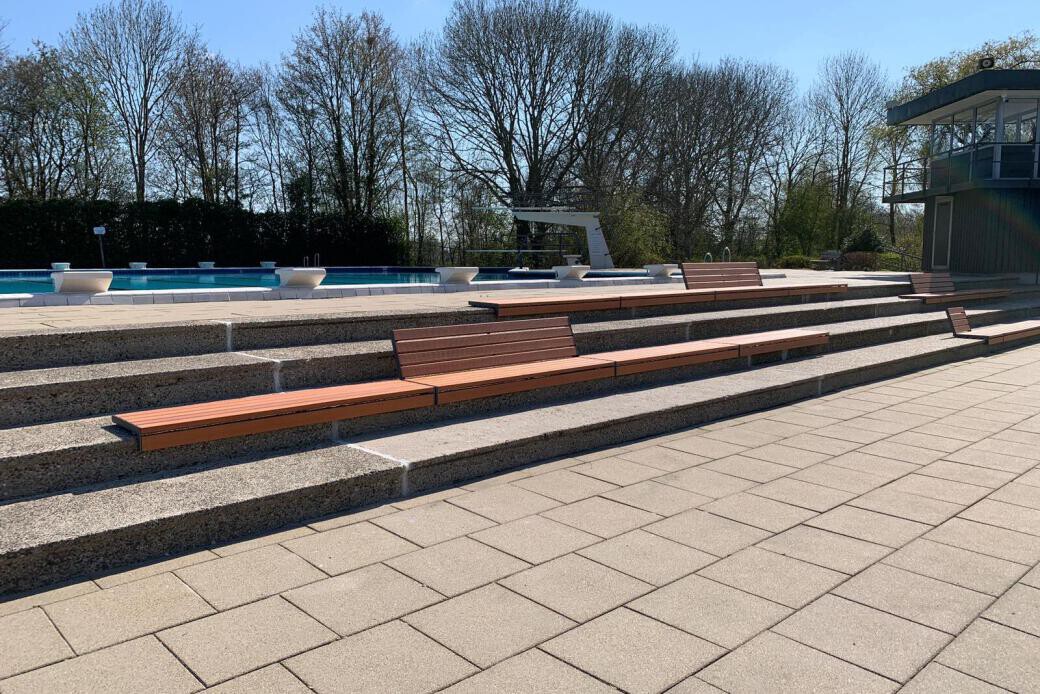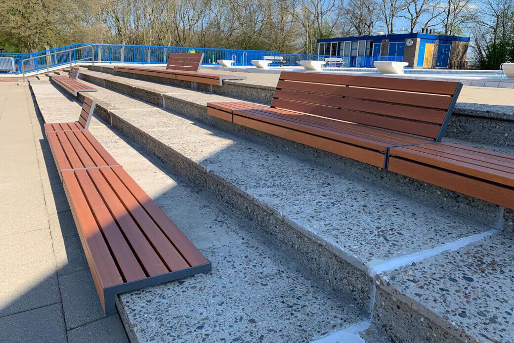 Voor de bezoekers van zwembad De Ganzewiel in Raamsdonksveer zijn er heerlijke sportieve en sociale ontmoetingsplekken gecreƫerd aan de rand van het buitenzwembad. Rondom het gerenoveerde zwembad zijn nu houten Hop Hop bankjes en zitelementen van Miramondo geplaatst.