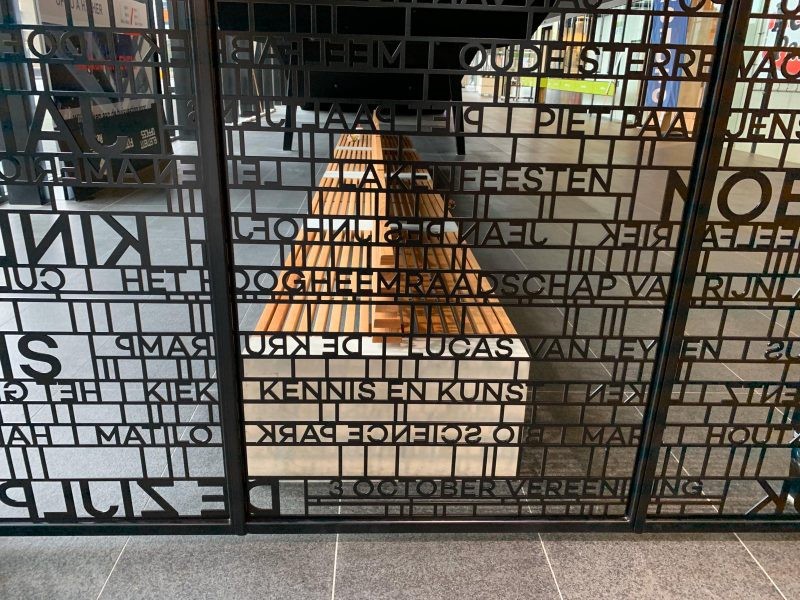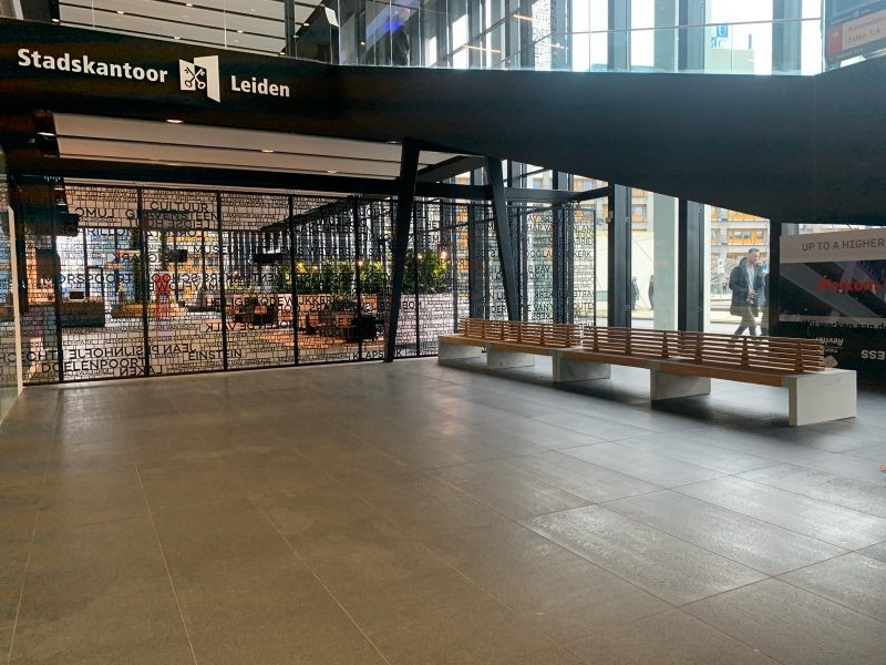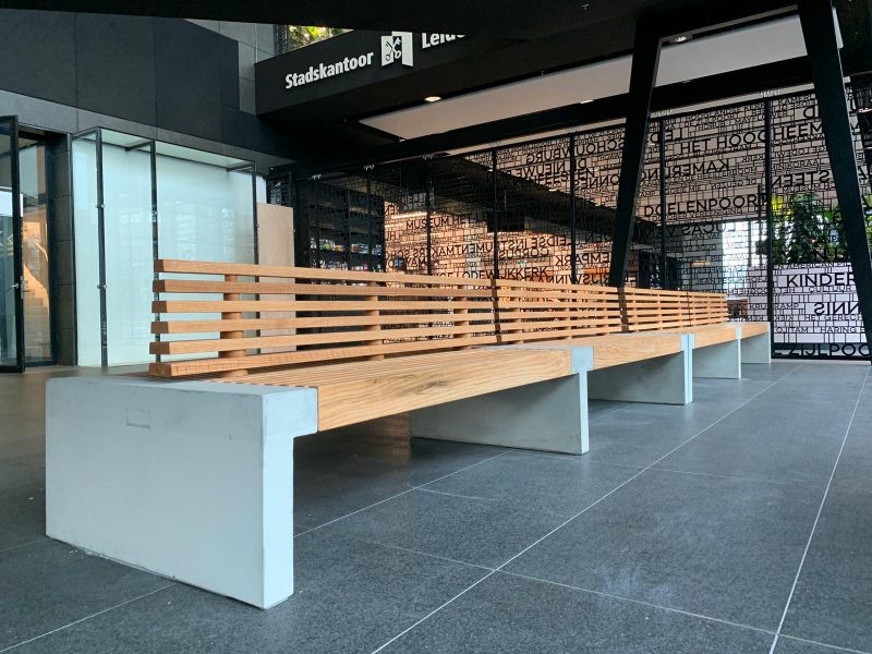 Houten Paxa banken met rugleuning voor Stadskantoor Leiden
