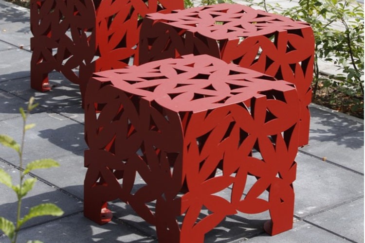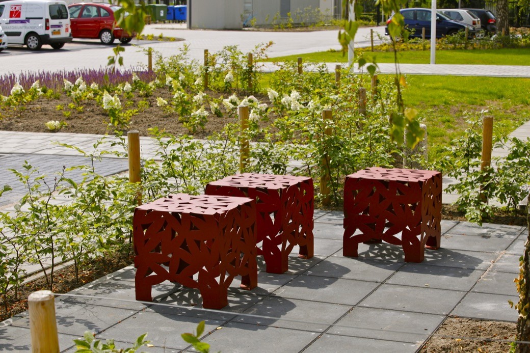 Terpstra koos voor stoere Hopper tafels met acht zitplaatsen van Extremis, aangevuld met rode Big Bux krukjes van Miramondo als eye catchers. “Die zijn ook te gebruiken als zitelementen. Bovendien zijn ze decoratief en transparant door het uitgelaserde bladmotief. Zo hebben we op verschillende plaatsen in de tuin prachtig vormgegeven ontmoetingsplekken gecreëerd. Plekken die uitnodigen om te gaan zitten en die ook nog een grote designwaarde hebben.”