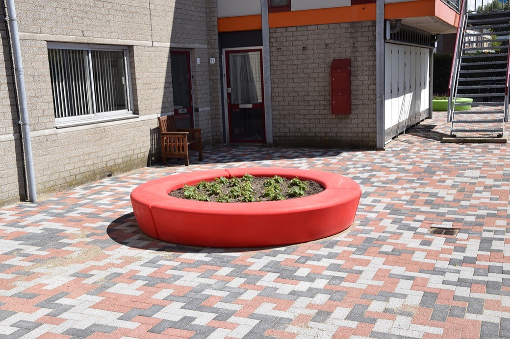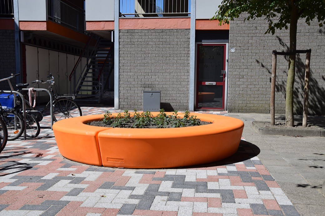 Pal voor de woningen zijn de Arc-elementen uit de Loop familie per drie stuks aan elkaar geplaatst. De bewoners aan het Kloosterpad kunnen dus weer met een glimlach naar buiten (kijken). De cirkelvormige objecten zijn vervolgens opgevuld met aarde en voorzien van beplanting. Multifunctioneel dus, want de levendige elementen worden als bank en als plantenbak ingezet. Een mooi aanblik voor zowel de bewoners als passanten, helemaal als de beplanting in het voorjaar tot bloei is gekomen!