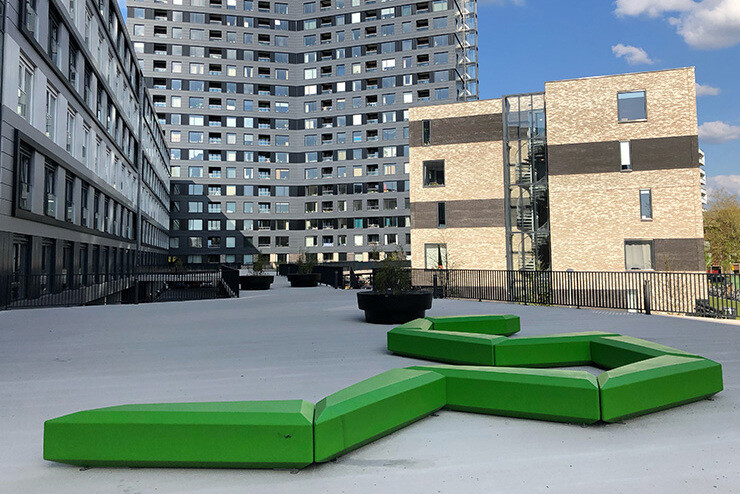 De groene Coffin Lounge banken staan afwisselend gepositioneerd in de zon en op schaduwplekken. Ze bieden de bewoners de ruimte om samen buiten te relaxen. Deze zitelementen zijn modulair en gemaakt van polyethyleen met een binnen frame van gegalvaniseerd staal. Polyethyleen is niet in water oplosbaar en heeft geen negatieve ecologische effecten. Alle onderdelen van het de Coffin Lounge banken zijn voor 100% recyclebaar en kunnen aan het einde van hun levenscyclus gemakkelijk van elkaar worden gescheiden.