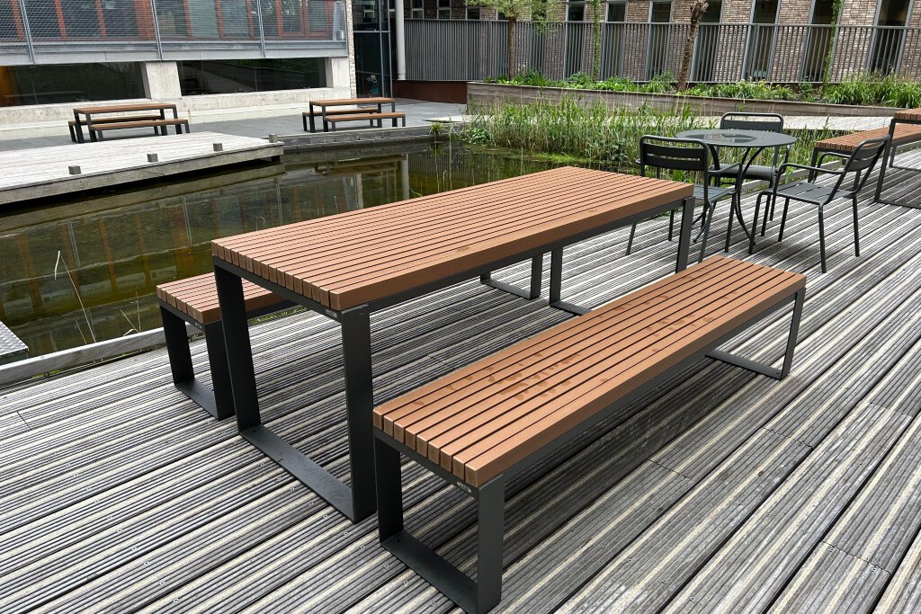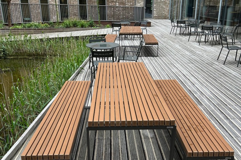 Rond de vijver staan stevige picknicktafels - functioneel én doordacht - ze zijn rolstoelvriendelijk en duurzaam. Tafels en banken staan los, zodat ze gemakkelijk verplaatst kunnen worden.