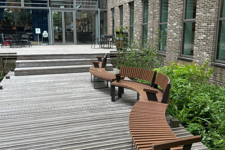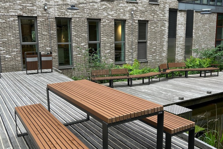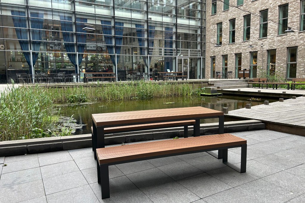 Het World Trade Center in Den Haag wilde de binnentuin - met vijver, terras en vlonders - een warmere, uitnodigende uitstraling geven. Hoewel de tuin sinds 2018 gebruikt wordt als duurzame buitenruimte voor pauzes en informele ontmoetingen, ontbraken sfeer en voldoende zitplekken. Tjinco werd gevraagd mee te denken over passend meubilair dat recht doet aan het professionele karakter van het gebouw én bijdraagt aan een uitnodigende buitenomgeving.