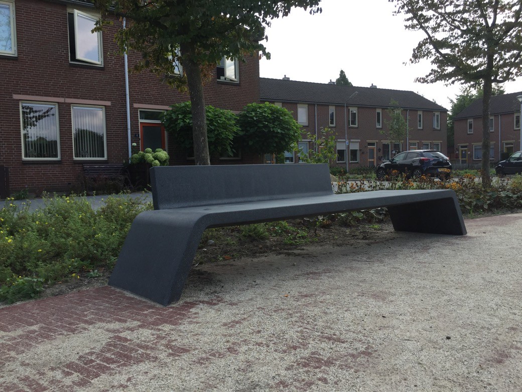 De betonnen banken zien er stoer en slank tegelijkertijd uit. Door de gladde en ononderbroken lijnen lenen de elementen zich voor iedere omgeving. Dankzij zijn enorme gewicht van het betonnen materiaal, is Mimetic vandalismebestendig. In het parkje zijn 3 elementen zonder - en een bank mét rugleuning geplaatst.