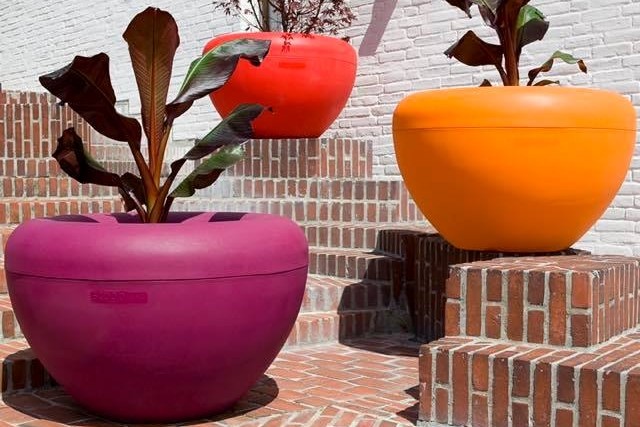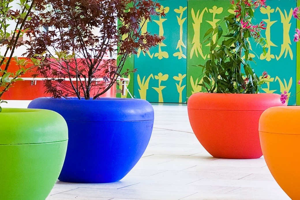 De bezoekers aan winkelcentrum Koningshoek in Maassluis worden welkom geheten door de vrolijk gekleurde plantenbakken Scoop van de firma Manga Street.