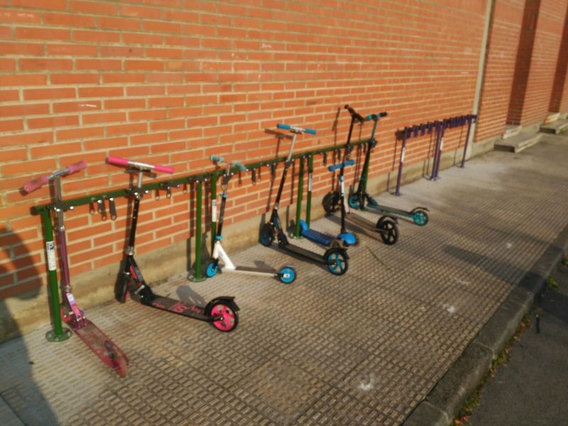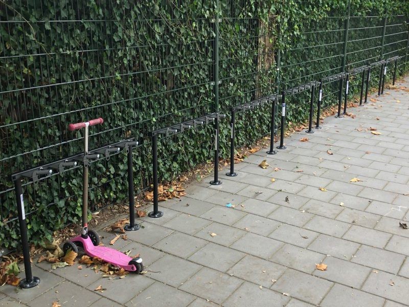 Al deze enthousiaste steppers bezorgde de school de nodige ‘opruim-zorgen’. De standaard fietsrekken zijn niet geschikt om steps in te stallen dus kwam het regelmatig voor dat de steps rondslingerde op het schoolplein of in de hal van de school.