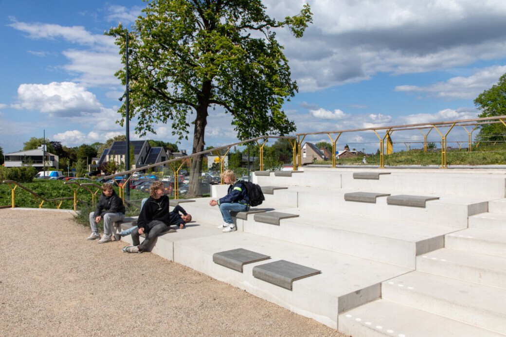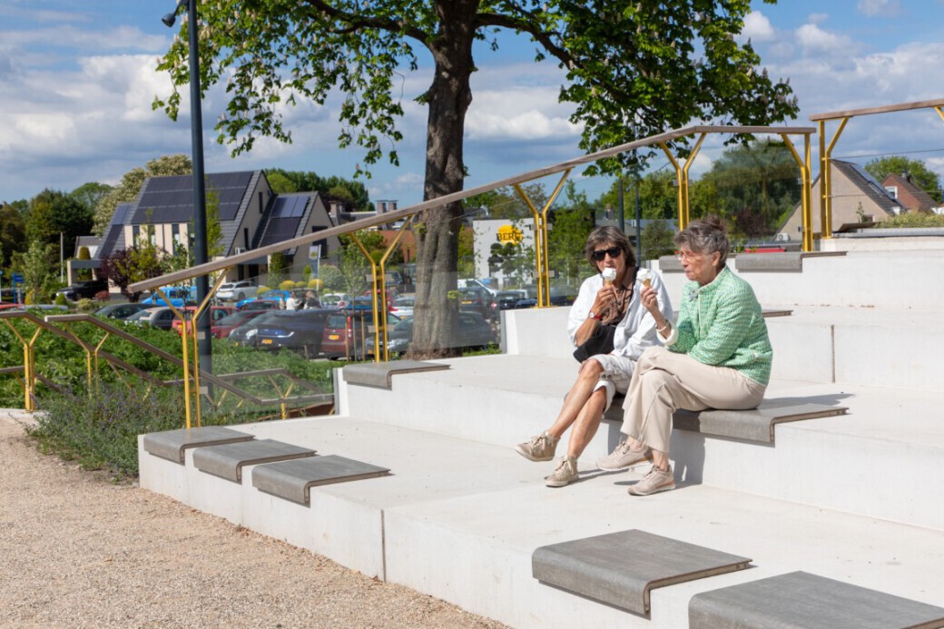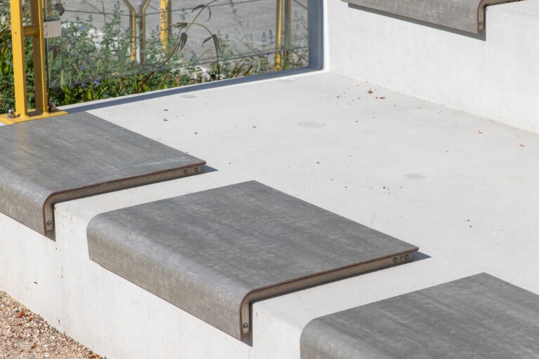 Er is gekozen voor Il Posto zitjes in de kleur Fumo – een stijlvolle, neutrale grijstint die mooi aansluit bij de materialen in de omgeving. Il Posto is ontworpen voor plekken waar mensen graag even zitten, maar waar de ondergrond dat vaak niet toelaat. Denk aan muren, trappen of betonnen randen: meestal koud, hard en onaangenaam. Dit slimme zitelement maakt van zulke plekken comfortabele, toegankelijke zitplaatsen. De zitvlakken zijn gemaakt van weersbestendig hogedruklaminaat, het frame van robuust roestvrij staal en het geheel is stevig verankerd met een vandalisme bestendig schroefsysteem.